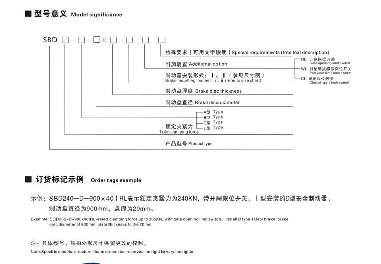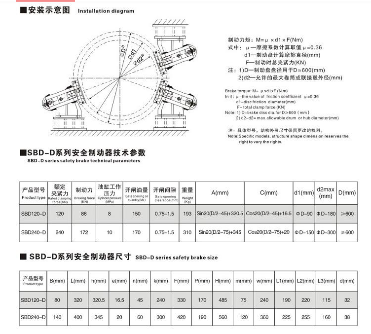 SBD-D系列液壓安全(緊急)制動(dòng)器,是一種使用在低速軸(卷筒軸)上的大功率制動(dòng)裝置,可廣泛用于大中型起重機(jī)、港口裝卸機(jī)械起升以及臂架府仰機(jī)構(gòu)低速軸的緊急安全制動(dòng)。礦用卷?yè)P(yáng)機(jī)、提升機(jī)和大功率傾角式皮帶運(yùn)輸機(jī)的工作制動(dòng)和緊急安全制動(dòng),纜車(chē)和索纜起重機(jī)驅(qū)動(dòng)機(jī)構(gòu)的安全制動(dòng),鑄造起重機(jī)等特種起重機(jī)起升機(jī)構(gòu)低速軸的安全(緊急)制動(dòng)。